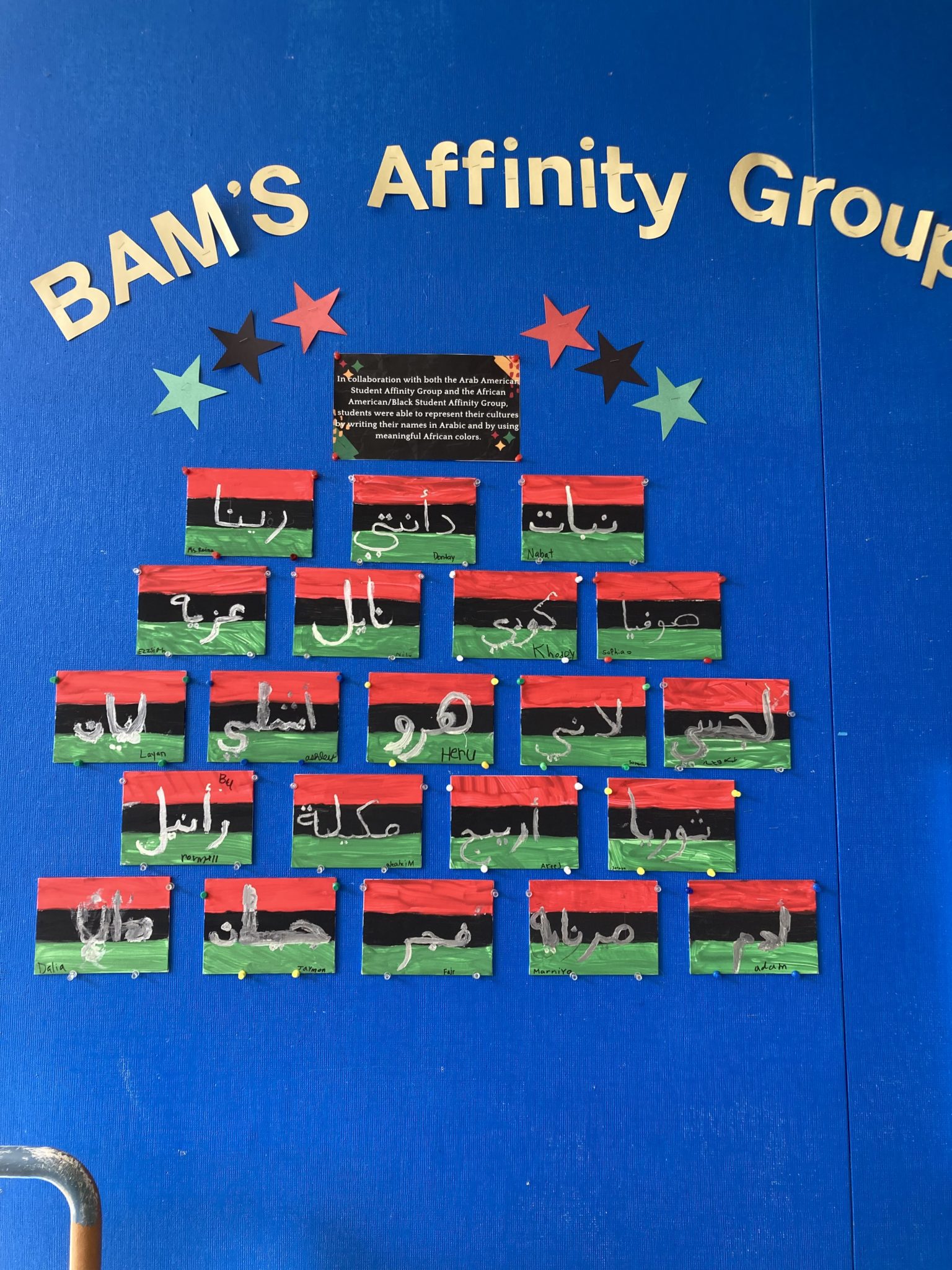 But Ahmed isn’t only building belonging within her Arab American group. In partnership with BAM colleague Dontay Gallon who leads a similar African American/Black student group at BAM, they designed an afternoon activity to help both student groups discover their common African roots. First, they placed a world map in the center of their circle and invited students to pinpoint their family’s homeland. “You’re from Africa too?” was a common refrain. Next they taught students how to write and then paint their names in Arabic. At a future collaborative meeting, Gallon will teach all of the students the symbolism behind the Pan-african colors. “We’re bringing all these kids together with different shades of skin. Regardless of skin color, we can all be from the same place!”