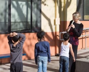 The dance teacher, Greacian Goeke, guided them through various exercises starting with playing different notes on a flute for the students to translate into movement and then contracting their bodies into a ball and then expanding as big as the sun. Inspired by each other’s “movement ideas”, they walked sideways like a crab as modeled by one classmate and wound their bodies up like a pretzel as shown by another classmate. Ms. Goeke led them through rhythm exercises with her drum, counting, “Uno, dos, tres!” and the children would make three different poses to the beat.