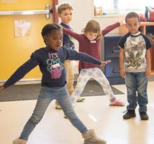It was clearly fun for the children, but there was a deeper meaning behind the movements that they are learning. As Ms. Goeke explains, “Dance is an extremely useful pre-literacy activity as they’re learning how to make straight and curved shapes with their bodies that can later be applied to writing and reading the alphabet.” The students are learning to think 3-dimensionally about the space that their bodies and movements inhabit, also known as “spatial awareness”, which lends itself wonderfully to conceptual thinking for little builders and engineers with their wood blocks and legos. The students are also learning about negative and positive space as Ms. Goeke instructs them to envelope themselves in an imaginary safety “bubble” which shouldn’t collide with other people’s bubbles. As the principal of King CDC, Isabelle McDaniel, explains, “Because kinesthetic learning is a vital component in early education classrooms, we anticipate seeing benefits beyond gross motor development and body awareness. Students will also have the opportunity to develop social skills and executive functions (self-regulation, entrance, focus, etc). “