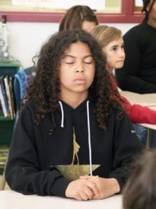 When asked about the most surprising effect of the program, Ms. Cohen responded, “I had assumed that our middle school students would be resistant to mindfulness but they were surprisingly open and receptive. One student even told me that the mindfulness program was his favorite moment of the day!” Ms. Cohen explained that she sees mindfulness permeating into all subjects as teachers or students lead mindfulness activities to transition from one class or activity into another. She described a school assembly the other day where an administrator encouraged mindful stretching of the body whenever students needed it.